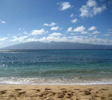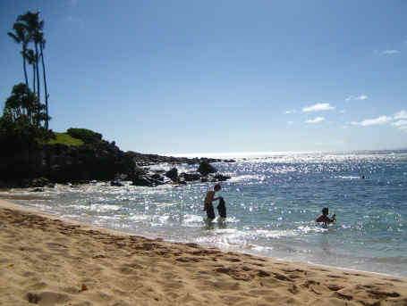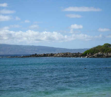 PARKING: A parking lot is located just North of the Sea House Restaurant. It can fill quickly. You can park along the road. ACCESS: From the parking lot, walk to the right under a tunnel. Access is fairly easy. BEACH: Virtually all sandy. Shady areas are not available. SWIMMING: It is somewhat shallow for a while and there are some rocks below the surface. One can swim here but it isn't optimal. SNORKELING: This is a nice snorkeling location on both sides of the bay. SURFING: Virtually straight out is an area called Scorpion. It is best left to experts. Waves build quickly from the North into a horseshoe shape and the reef is virtually exposed right before the wave breaks. After catching the wave, unless one "gets out" early enough, one can end up on a very shallow reef or hit rocks. It's exciting but dangerous. |